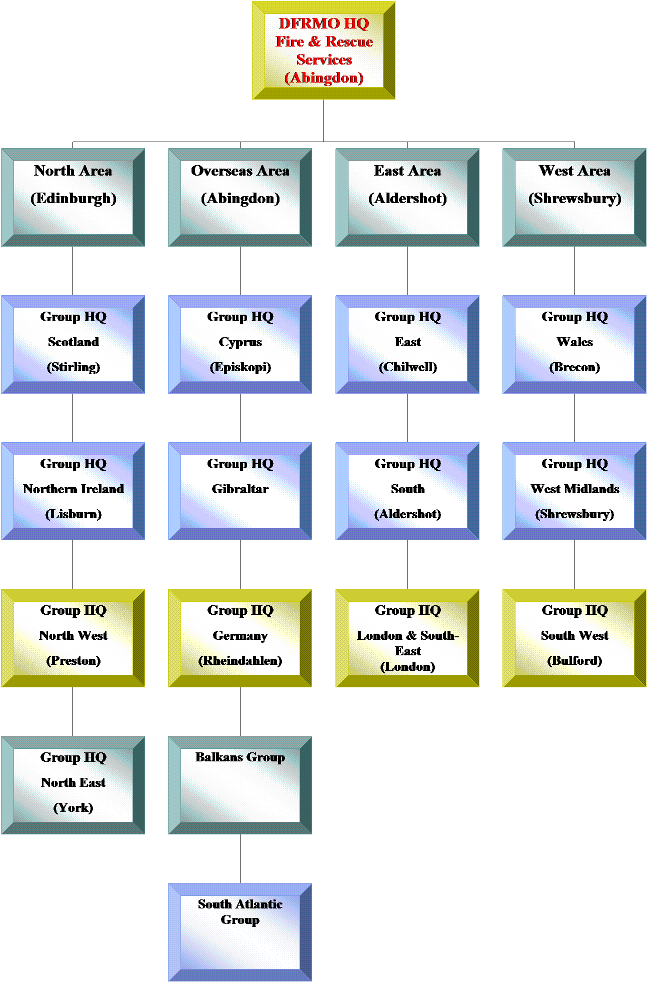 On 4 September 2006 the changes took effect and the Defence Fire Risk Management Organization (DFRMO) was created at Abingdon to direct all MOD Fire Services world wide including RAF Trade Group 8 Fire Fighters and Royal Navy Aircraft Handlers. The chain of command is then divided geographically into Areas and Groups as follows: